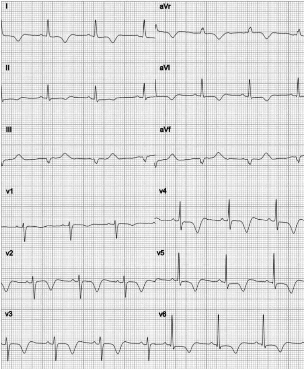 Seeking consultation at the Hospital, the patient’s blood pressure was 136/110 mmHg. Subsequent electrocardiogram (ECG) corroborated the initial findings and echocardiogram findings revealed left ventricular hypertrophy (LVH), with normal Troponin I levels. The prescribed medications included Tellzy MT, Ecospirin AV 75/10, and T3 plus.