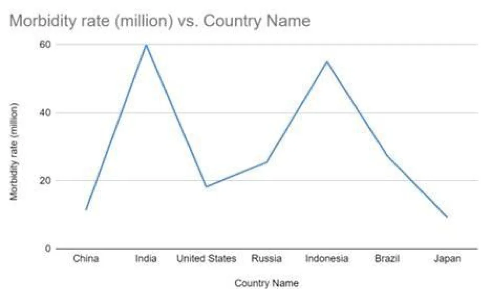 Beyond the borders, the rate of morbidity from cardiovascular disease in 2021 will be 11.39 million people are affected in China. India has 60 million people. 18.3 million Americans live in Russia, which has 25.5 million inhabitants. Indonesia is home to 55 million people. 9.25 million people live in Japan, and 27.4 million people live in Brazil.