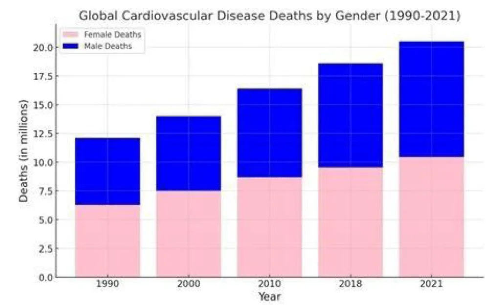 Here is the bar graph showing global deaths due to CVDs from 1990 to 2021, broken down by gender (Figure 2). From 1990 to 2021, global deaths due to cardiovascular disease (CVD) increased significantly. In 1990, there were 12.1 million deaths, with 6.3 million females and 5.8 million males. By 2000, deaths rose to 14 million, with female deaths increasing to 7.5 million and male deaths to 6.5 million. In 2010, the total reached 16.4 million, with 8.7 million females and 7.7 million males. The trend continued upward in 2018, with 18.6 million deaths, including 9.56 million females and 9.04 million males. By 2021, total deaths had climbed to 20.5 million, with 10.45 million females and 10.05 million males. This data reflects a steady rise in CVD-related mortality over the decade.