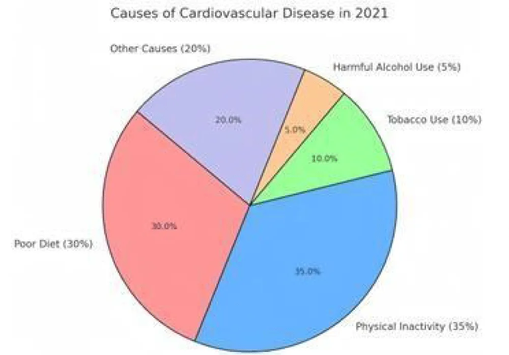 Here we can see that physical inactivity is the leading cause, accounting for 35% of cases, followed by poor diet at 30%. Tobacco use and harmful alcohol consumption contribute 10% and 5%, respectively, while other causes make up the remaining 20 % (Figure 3).