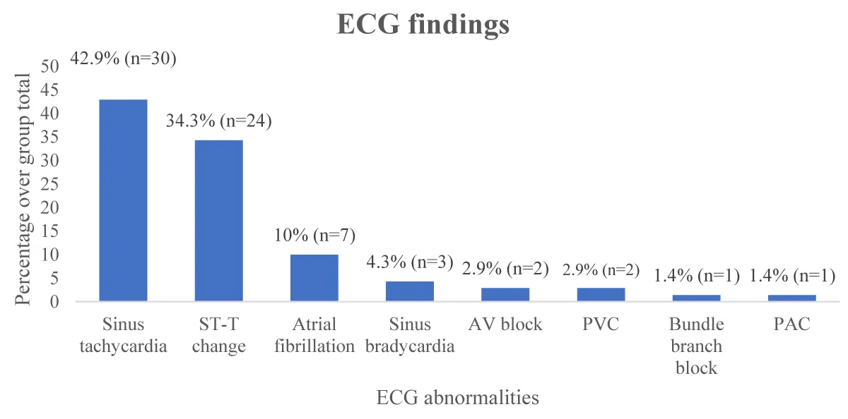 In Figure 1 out of 140 patients, 70 had normal ECG (Group-A). Among the group with abnormal ECG findings (Group-B), sinus tachycardia was maximum (42.9%) followed by ST-T change (34.3%), atrial fibrillation (10%), sinus bradycardia (4.3%), AV block (2.9%), premature ventricular contraction (2.9%), premature atrial contraction (1.4%) and right bundle branch block (1.4%).
