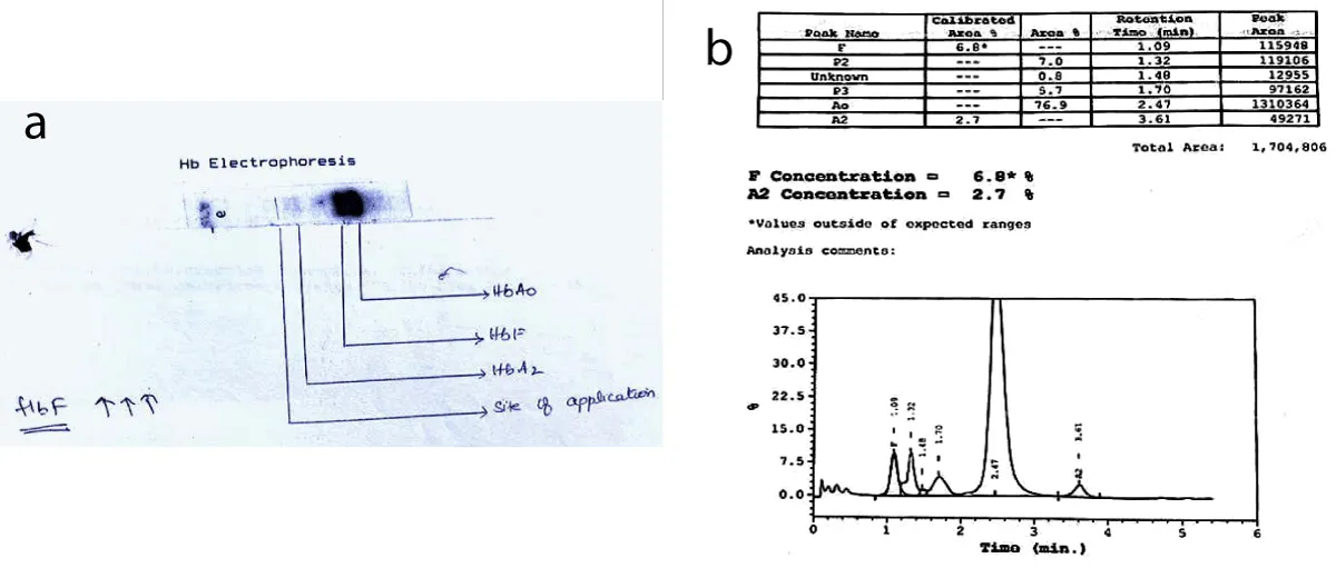 Figure 1: a: The gel electrophoresis pattern for Hemoglobin F(HbF) typically shows a distinct band or peak that corresponds to the HbF molecule. b: Hemoglobin electrophoresis shows significant elevation of hb A. x axis-time; y axis; Percentage of Total hemoglobin.